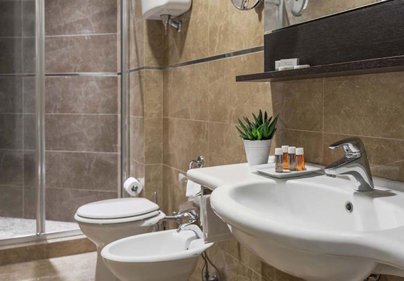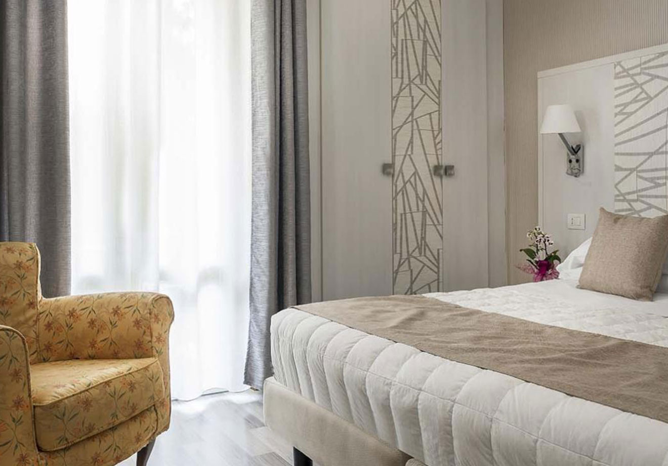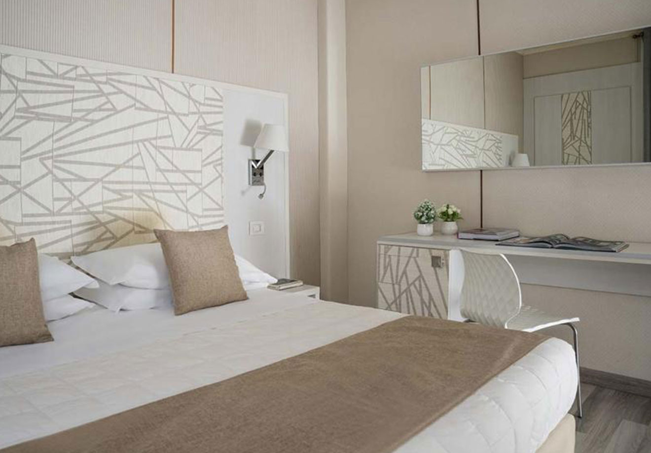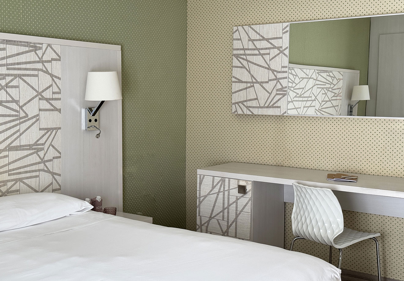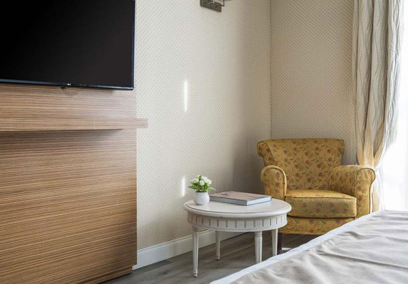 We offer a variety of room types: single, double/matrimonial, triple, family, and junior suites, with the option to choose between standard and deluxe. All rooms are spacious, bright, and decorated in soft tones to suit every style and comfort preference.